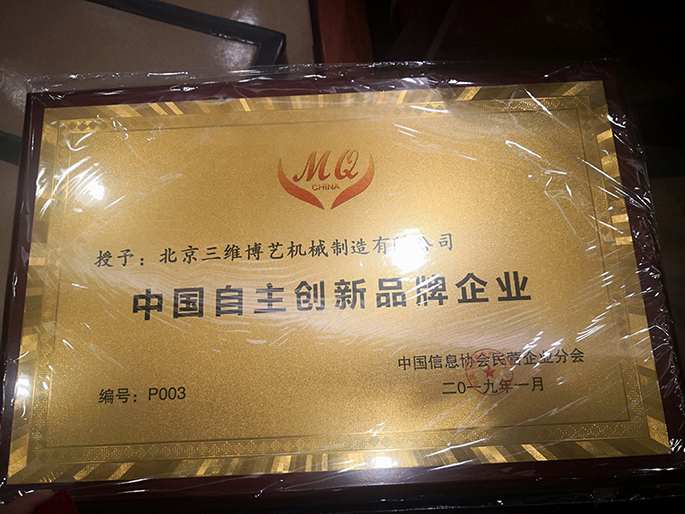 熱烈祝賀北京三維博藝機(jī)械制造有限公司2019年1月獲得中國自主創(chuàng)新品牌企業(yè)稱號,新的一年有個好的開始,讓我們?nèi)w員工擼起袖子加油干,保護(hù)好今天擁有的,創(chuàng)造明天想要的。